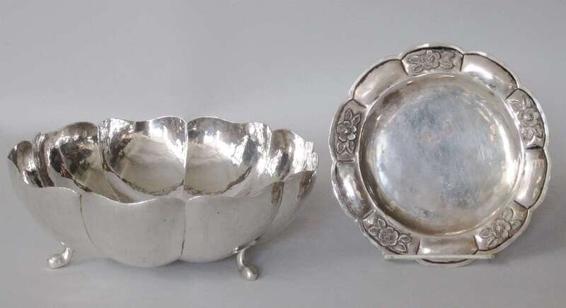 Of petal form on three feet, marked "PH"; together with a sterling silver plate having a shaped edge with repoussé flowers to border.