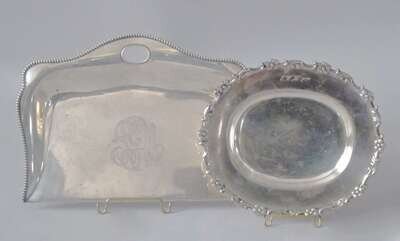 Of oval from with a floral and scrolled border; together with a sterling silver crumb tray having a beaded edge, both having monogram.