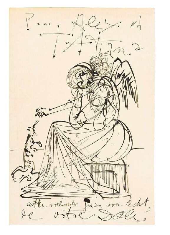 Inscribed and dedicated 'Pour Alex et / Tatiana / cette meloncholie juan avec le chat / de votre Dali,' india ink on wove paper