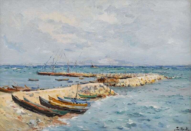 FRANÇOIS NARDI (FRENCH 1861–1936) BOATS BEACHED ON JETTY ROCKS