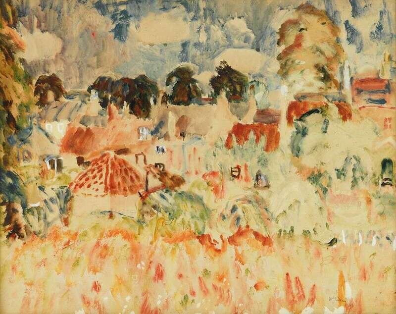Signed and dated 'W. Gillies / 1942' in pencil bottom right; also inscribed with title and signed in ink on label verso, watercolor on paper