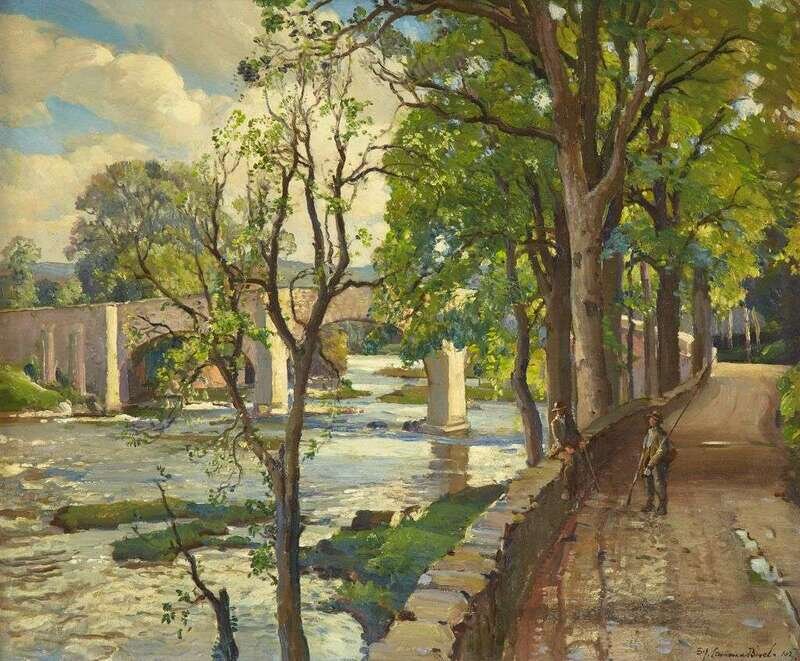 SAMUEL JOHN LAMORNA BIRCH (BRITISH 1869-1955) TRAVELLERS ON A FOOTPATH ALONG A RIVER