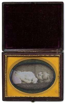 Ca. 1860. Quarter plate daguerreotype with handcoloring in oval embossed brass mat and leather case with with deep red velvet lining (probably not original to piece). Photographer's name incised into plate verso.