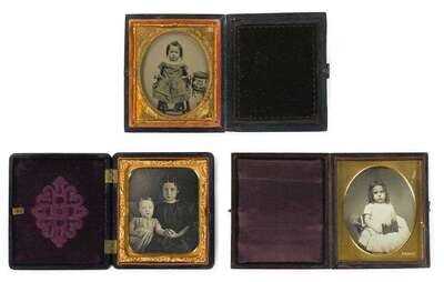Mostly sixth plate daguerreotypes depicting children in various poses. Some with partial cases and original seals.