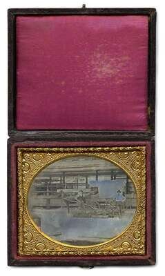 UNKNOWN ARTIST OUTDOOR DAGUERREOTYPE OF TWO MEN AND A HORSECART OUTSIDE OF JAMES D. GAY, SEEDSMAN