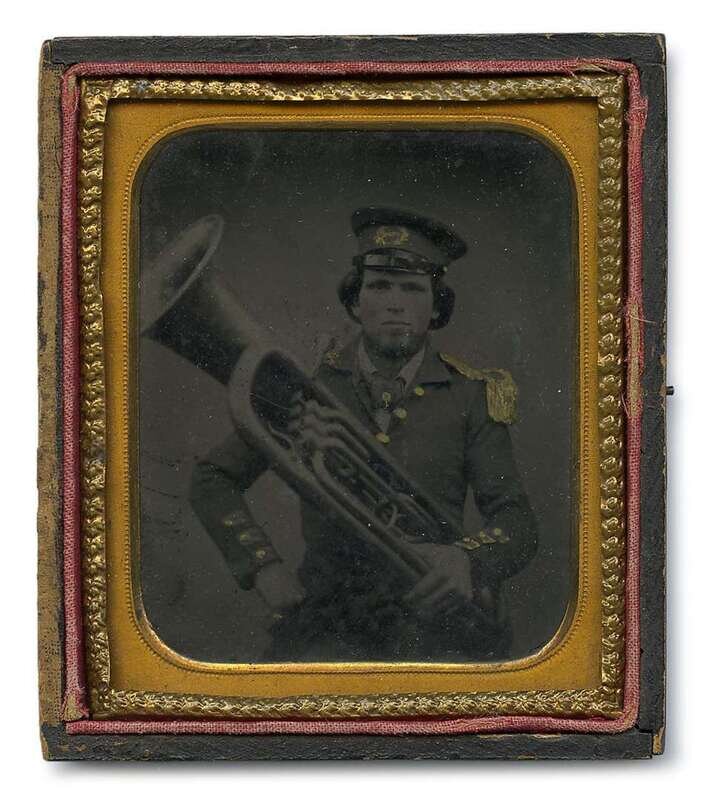 TWO TINTYPESUNKNOWN ARTIST TINTYPE OF MEXICAN-AMERICAN WAR SOLDIER WITH TUBA