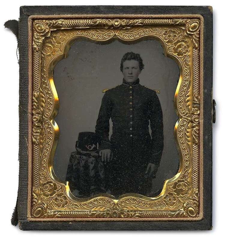 Ca. 1860, a sixth-plate ambrotype with gilt accents in period, embossed case with nonpareil, embossed brass mat accompanied by a sixth-plate tintype with gilt accents in period case with embossed, patriotic motif with oval, embossed brass mat.