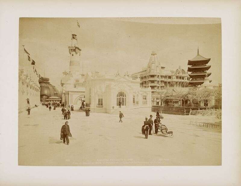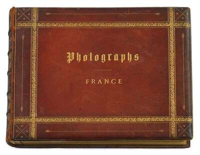 Album of 41 albumen prints of Paris, Biarritz, Lourdes, Château de Pau, and several of the Exposition Universelle de 1900. Photographs mounted to board and bound in red leather cover.