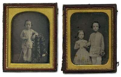 Two quarter plate daguerreotypes depicting children, each in brown leather cases, missing covers.