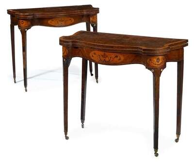 Pair of George III mahogany, burr yew and inlaid card tables late 18th century