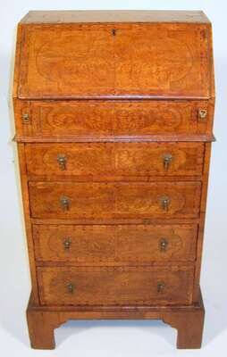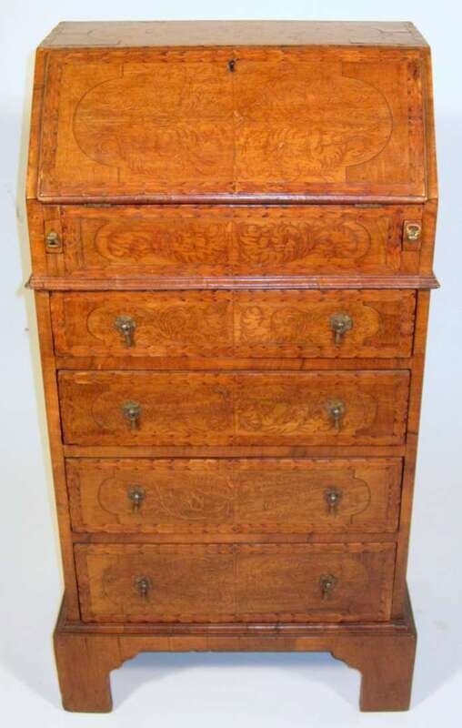 Diminutive George I seaweed marquetry inlaid walnut bureau early 18th century and later, the marquetry in the style of gerrit jensen