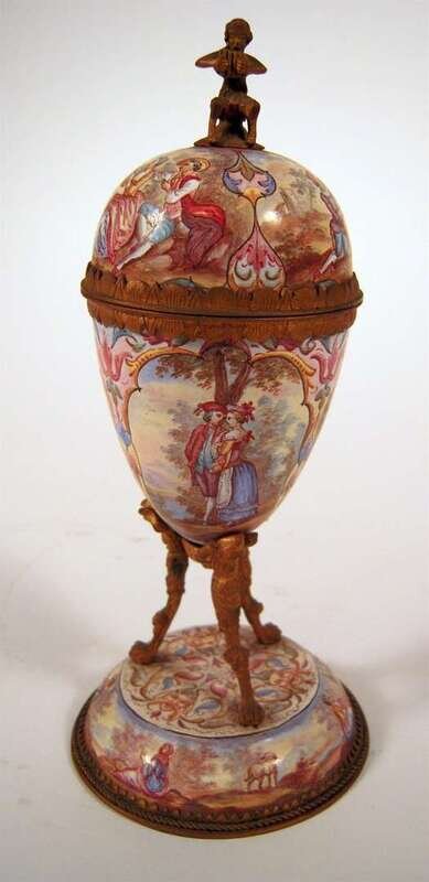 The domed cover with satyr finial, the body worked to show 18th century couples in landscapes, raised on tripod base with circular plinth.