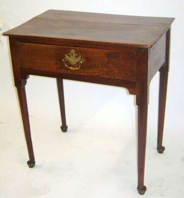The rectangular top with rounded fore-corners over single drawer above shaped apron, raised on tapering cylindrical legs terminating in pad feet.