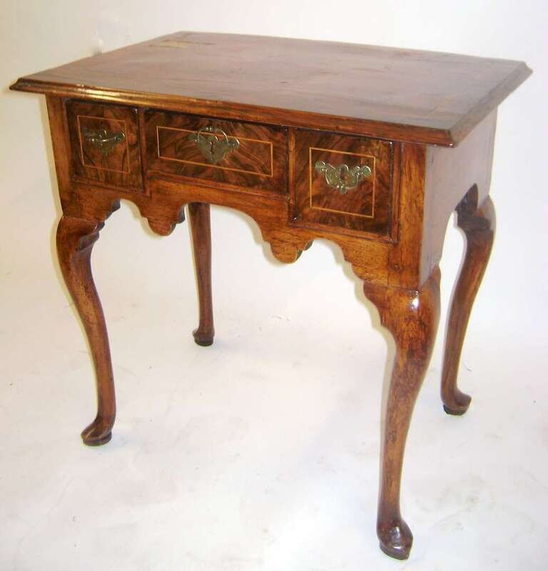 The rectangular top with molded edge, over central long drawer flanked by short drawers, above a shaped apron, raised on cabriole legs terminating in pad feet.