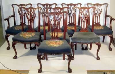 Comprising two armchairs and six side chairs, the acanthus carved toprail above pierced vasiform splat, needlepoint stuff over seat, raised on acanthus carved cabriole legs terminating in claw and ball feet.
