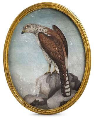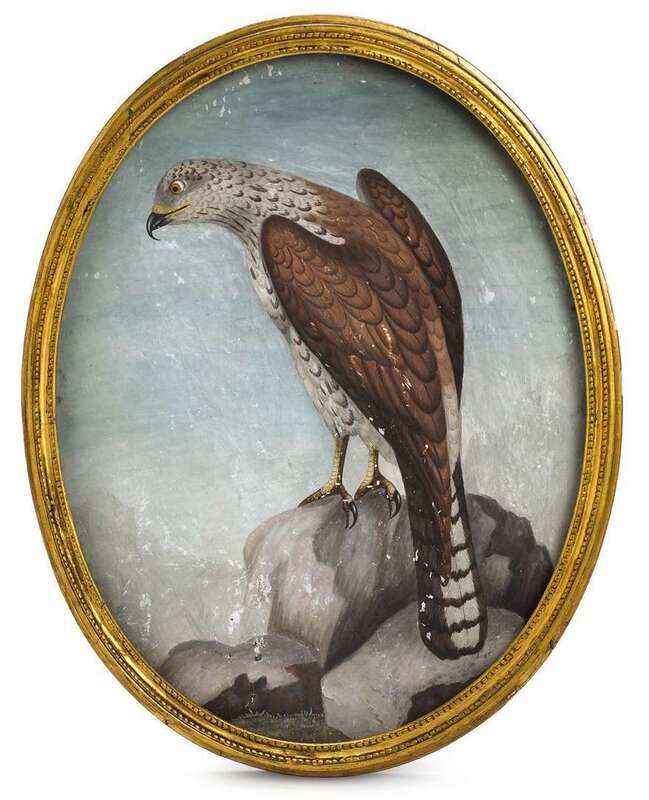 The oval painting depicting a sparrowhawk, apparently unsigned, with giltwood frame.