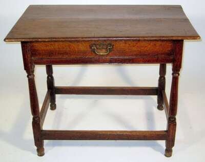 The rectangular planked and cleated top, over single drawer, raised on turned baluster supports joined by stretchers, terminating in cylindrical feet.
