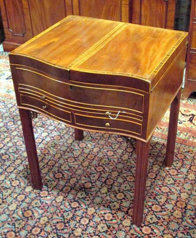 The serpentine crossbanded and strung top lifting in two sections to reveal a series of compartments and central mirror, above a brushing slide and two drawers, raised on fluted legs.