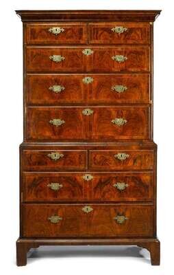 In two parts: the cavetto molded cornice above two short and three long drawers, the base with two short and two long drawers, raised on bracket feet.