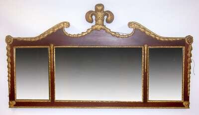 The central rectangular mirror plate flanked by two smaller mirror plates, within broken pediment, feather, rosette, and lion's mask carved frame.
