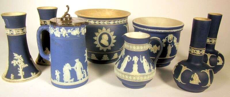 Comprising two Wedgewood jasperware jardinieres, one incorporating profile portraits of Benjamin Franklin, Alexander Hamilton, and George Washington; two pairs of Adams vases; and two Wedgewood jugs, one with silverplated lid.