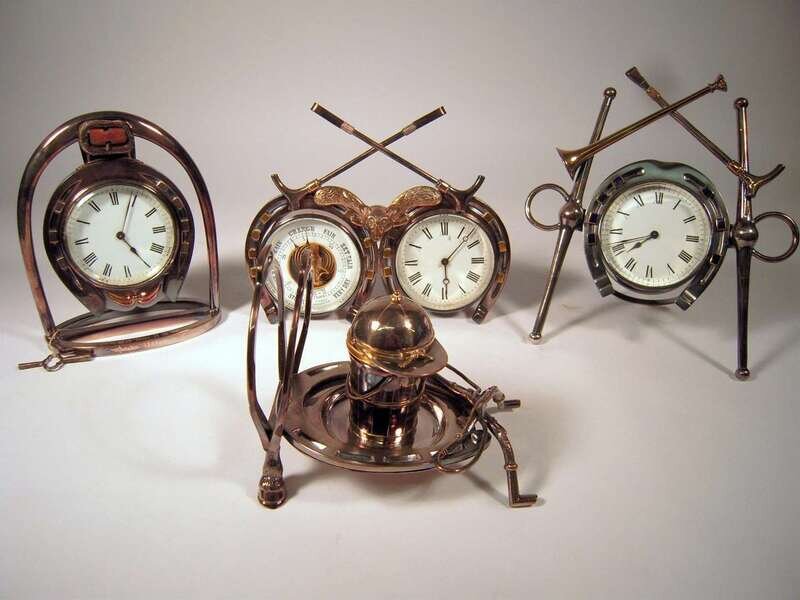 Comprising two clocks with circular white enameled dials and Roman numerals within horseshoe surrounds, one engraved "G.N. from H.H. October 1882"; an inkwell in the form of a coopered barrell with jockey's hat form lid, on horshoe form stand; and a clock and barometer within horseshoe surrounds surmounted by a brass fox head and two riding crops. (4).