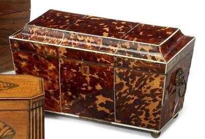 Sarcophagus form, the rectangular hinged lid with cavetto edge opening to two tortoiseshell veneered caddies flanking central recess, over tapering body mounted with twin lion's mask handles, raised on brass ball feet.