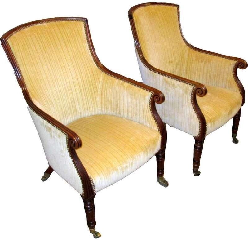 The fluted top and arm rails terminating in scroll ends, above upholstered and studded back, sides and stuff-over seat, raised on turned legs terminating in brass caps and castors.