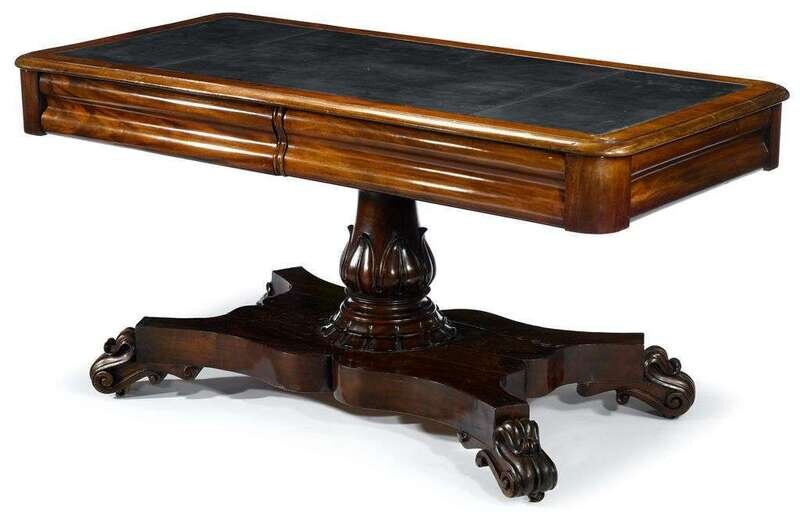 The rectangular leather inset top over curved frieze with two drawers, on bud-form carved support, raised on shaped rectangular base issuing four boldly carved scroll feet on castors.