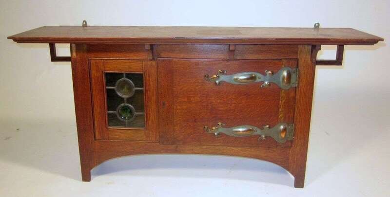Arts and Crafts oak, stained glass and copper mounted hanging wall cabinet late 19th century