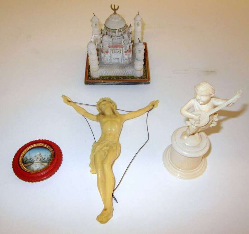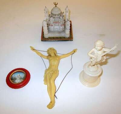 Comprising a marble carving of the Taj Mahal, a miniature painting on ivory of the Taj Mahal, a carved ivory figure of Jesus Christ, and a carved ivory figure of a cherub.