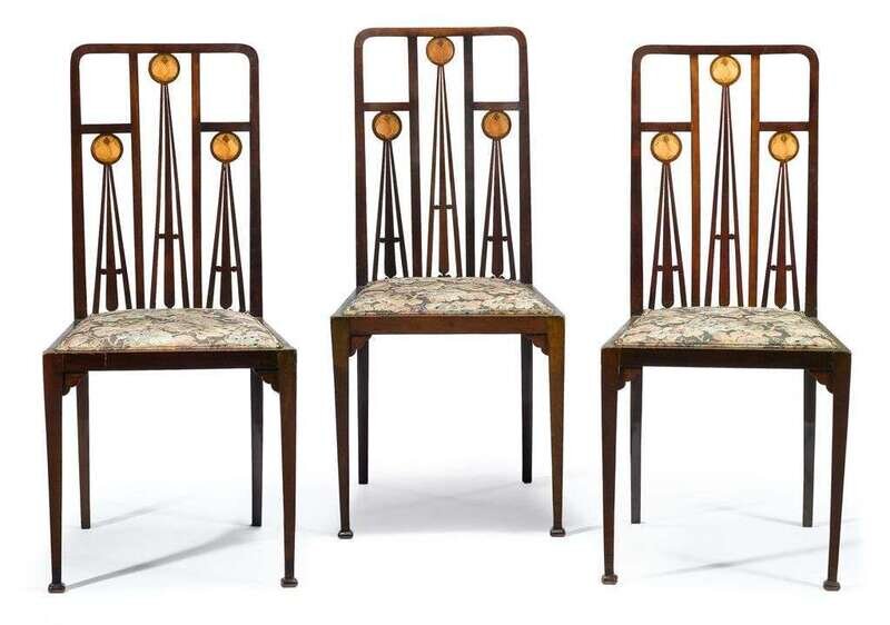 Three Art Nouveau marquetry inlaid sidechairs early 20th century, retailed liberty and co.