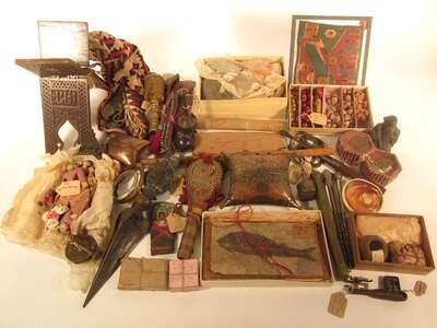 Including a yak bone Tibetan prayer wheel; bronze Tibetan 'Devil Dagger'; Koran stand; fossilised fish; Middle Eastern brass pen case; Peruvian pottery fragment; various small brass and bronze Buddhas and Ganesh figures; Mate spoons; Damascus needle case; Ceylonese and Indian rattles; and numerous others, almost all with tags noted in manuscript and variously dated c.1890-1922 describing the object, where found, and the date acquired, all in a wicker basket.