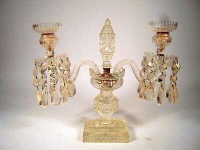 The faceted standard issuing two scroll candlearms supporting drop-lusters, raised on rectangular plinth base.