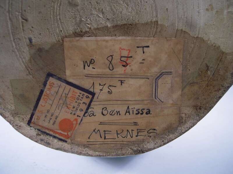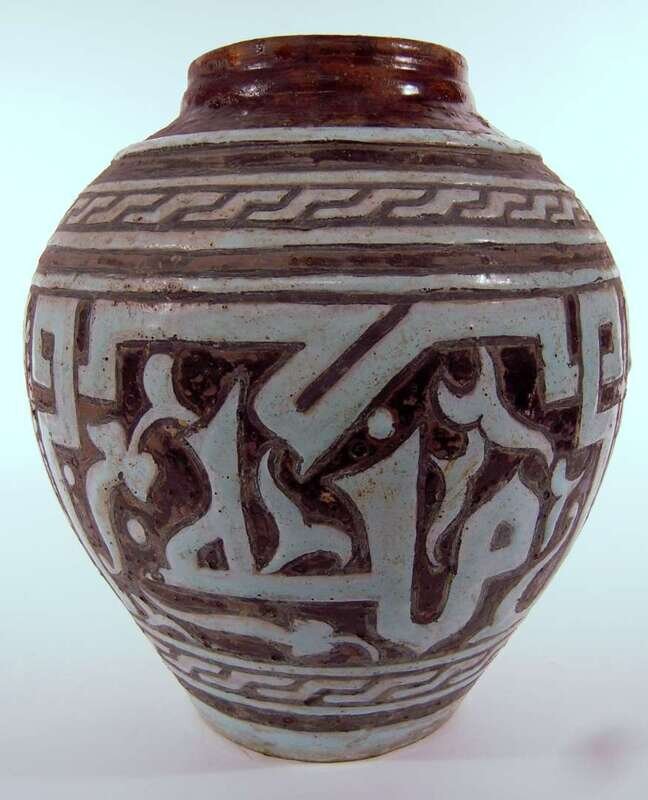 Globular form with pronounced rim, sky blue and brown glazes worked to show Arabic script, signed in Arabic in interior, old inventory label and U.S. Customs label for exhibition in the 1939 New York World's Fair to underside.