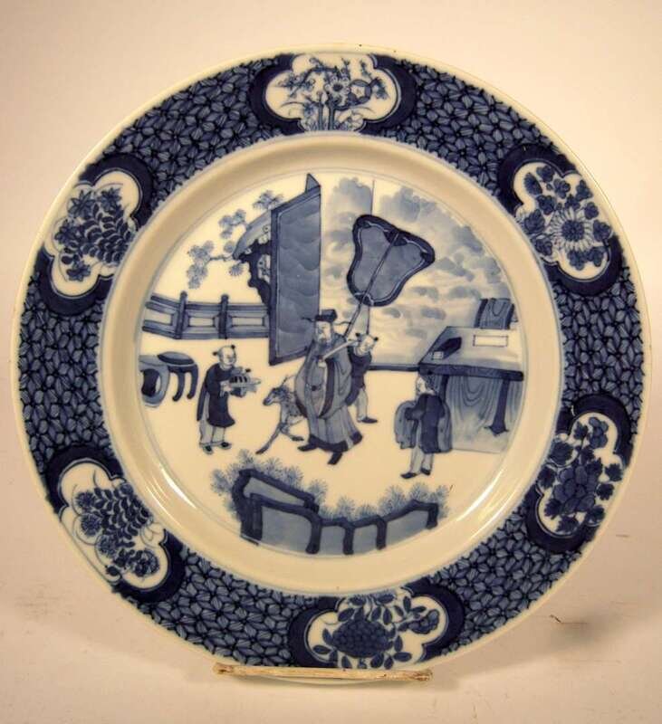 Circular, painted to show figures in an interior setting, the rim painted to show reserves of flowers and trees surrounded by lattice.