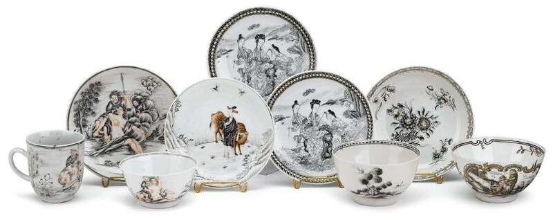 Comprising a mythological teacup and saucer, painted to show Jupiter and Io; a demi-tasse cup painted in the same pattern; a rice bowl painted to show to a monk seemingly being baptised; two grisaille saucers painted to show female figures in front of a lake; a saucer painted to show a man and a donkey; and a matched teacup and saucer painted to show a castle and European flowers. (9).