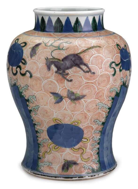 Baluster form, lappet band to neck over well enameled mythical beasts and blue underglazed Buddhistic emblems, all over iron-red swirl ground buff drilled foot.