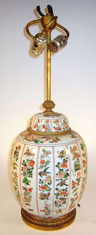 Ovoid form with domed cover, painted to show birds, insects, and floral motifs; with gilt bronze mounts inscribed 'E.F. Caldwell & Co. Inc, New York'. Mounted as lamp.
