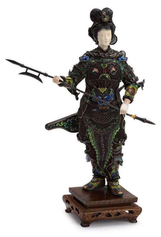 Chinese enameled silver, filigree and ivory figure of a female warrior