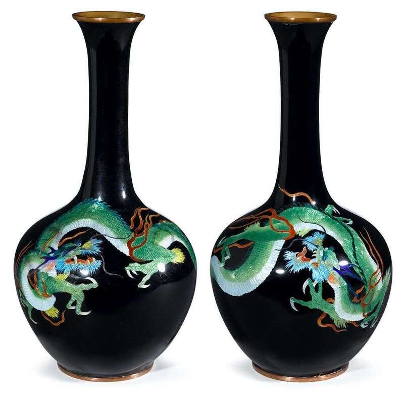 Good pair of Japanese cloisonne enamel black dragon ginbari vases meiji period, attributed to hayashi hachiezaemon, one with hayashi mark to base