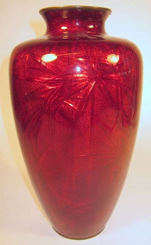 Baluster form, ox-blood enameled to show foliage on a dot ground. Ando mark to underside.