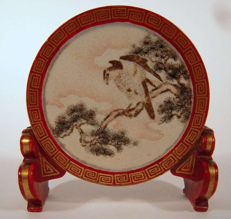 Circular form, one side painted to show a hawk in a tree, the other side tortoises, within gilt Greek key borders on a red ground, raised on stylised basket legs, signed to underside.