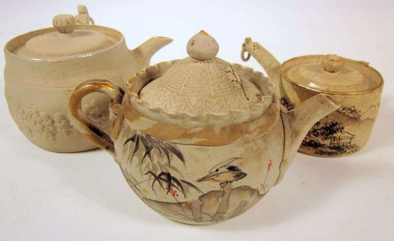 Comprising a teapot with side handle molded to body with boys crossing a river; a teapot with side handle and straight sides painted to body with village scene; and a round teapot with ribbon form handle painted with bird and flowers.