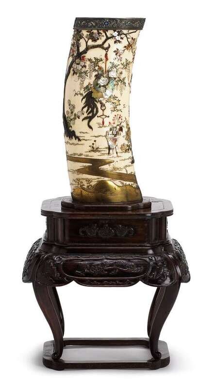 Fine Japanese enameled gilt metal mounted, gilt lacquer and shibayama ivory tusk on stand meiji period