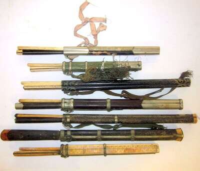 Each comprising a pair of chopsticks and a knife housed in a sheath, including three with shagreen sheaths, one with tortoiseshell sheath, one with bone sheath and one with hardwood sheath, all with metal mounts; together with a dagger in a shagreen sheath. (7).