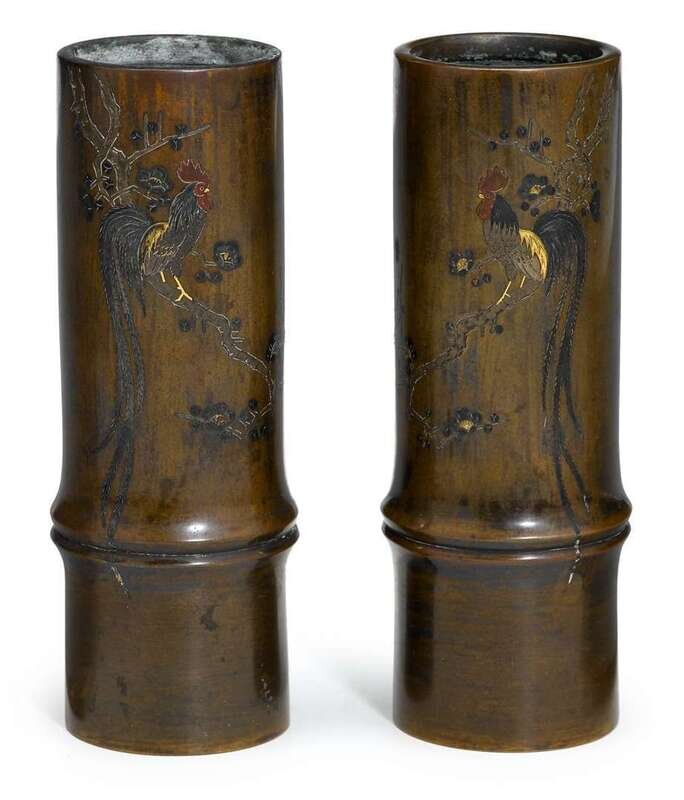 Cast to simulate bamboo, engraved and decorated in red and gilt to show roosters, signed.