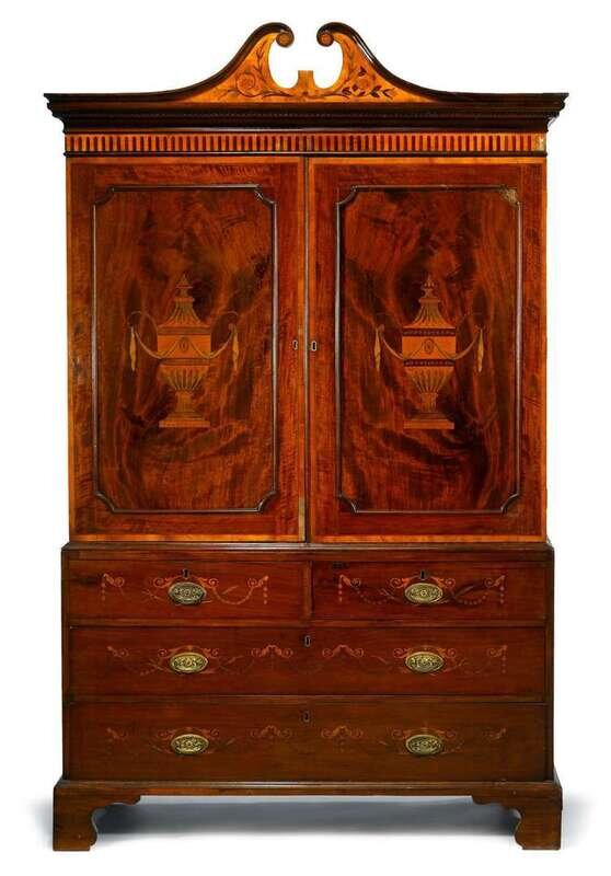 In two sections, the upper section with swan neck pediment over twin panelled doors inlaid to show neclassical urns, the base with two short over two long drawers, raised on bracket feet.