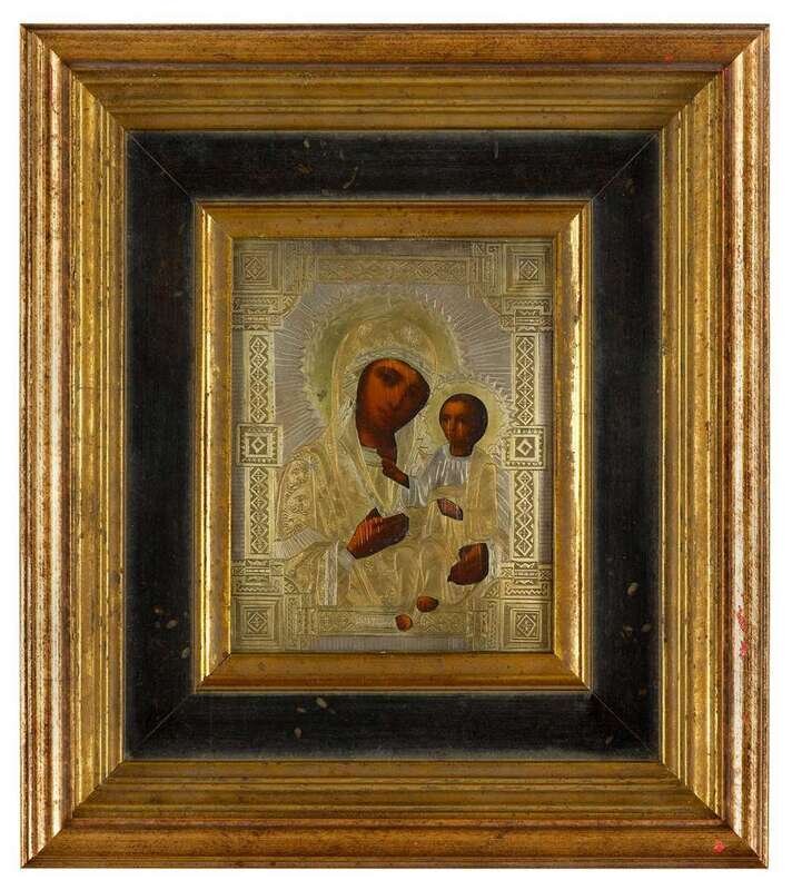 Painted to show the Virgin Mary and Christ beneath silver gilt riza on felt-backed board, in glazed shadow box.