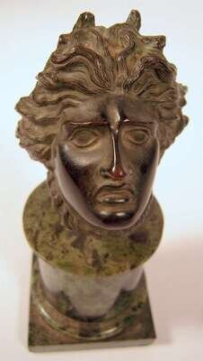 Depicted with an alarmed expression and snakes in her hair, raised on verde antico marble pedestal.